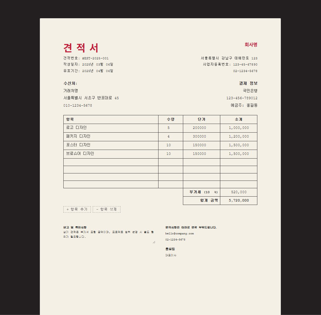 70년대 사무실의 감성을 담은 클래식 견적서입니다.레트로한 타자기 서체와 따뜻한 크림색 용지 위에, 빨간 잉크로 찍힌 제목이 빈티지 비즈니스 문서의 무드를 재현합니다. 항목·수량·단가를 입력하면 부가세와 합계가 자동으로 계산되며, 작성 즉시 PDF 또는 엑셀로 내보낼 수 있습니다.