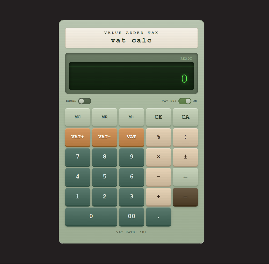 70~80년대 전자계산기의 클래식한 무드를 재현했습니다.부가세(VAT) 자동 계산, 퍼센트 연산, 메모리 기능을 갖추고 있어 실용성도 놓치지 않았습니다.